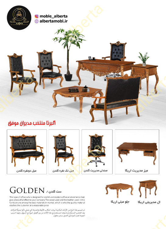 این ست اداری شامل یک عدد میز مدیریت سایز 180 همراه با دو کشو :دو عدد مبل تک نفره و یک عدد مبل دونفره :سک عدد جلو مبلی و یک عدد صندلی مدیریتی می باشد.